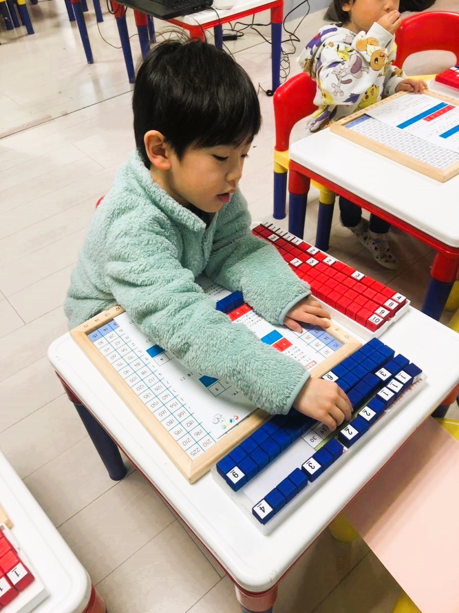 公式の暗記ではなく、教具操作を通じて数の仕組みや概念や図形の性質をあそび感覚で理解。「なぜそうなるの?」を大切にし、算数の面白さを知ることで、論理的思考力と直観力の土台を築きます。